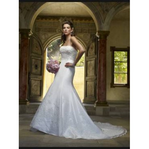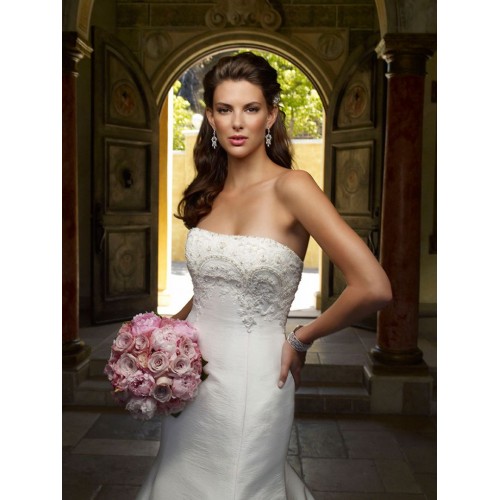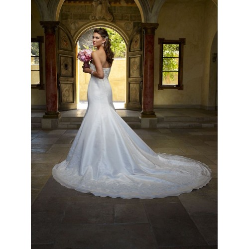 Glamorous trumpet shaped silhouette adorning pearl and sequined lace appliques finishing with a regal cathedral length train. This beautiful strapless gown accented with Swarovski buttons shimmers at all angles.
