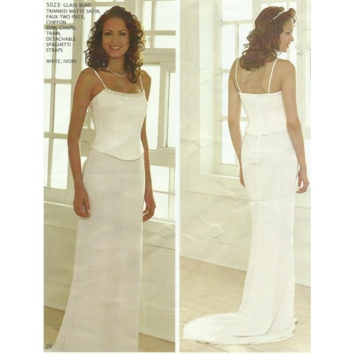Style 5023 Glass Bead Trimmed Matte Satin, two piec chiffon semi-Chapel Train detachable spaghetti straps. size 6